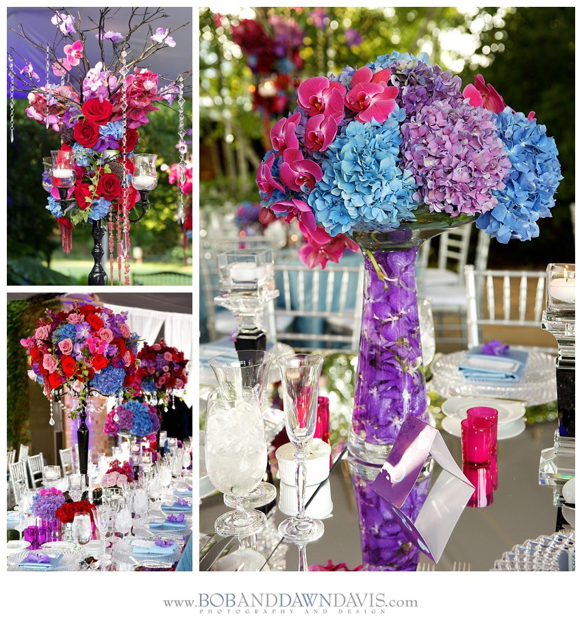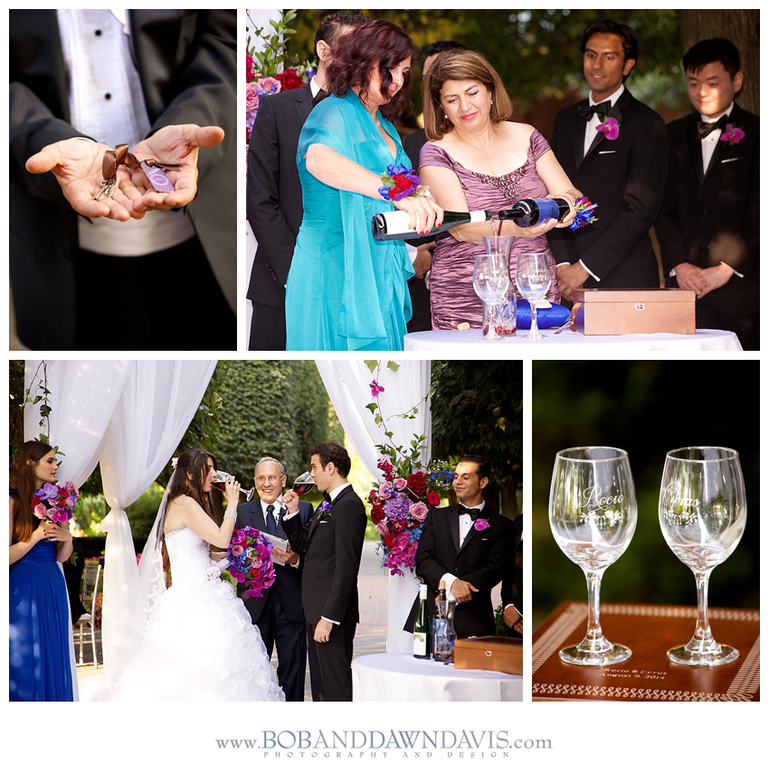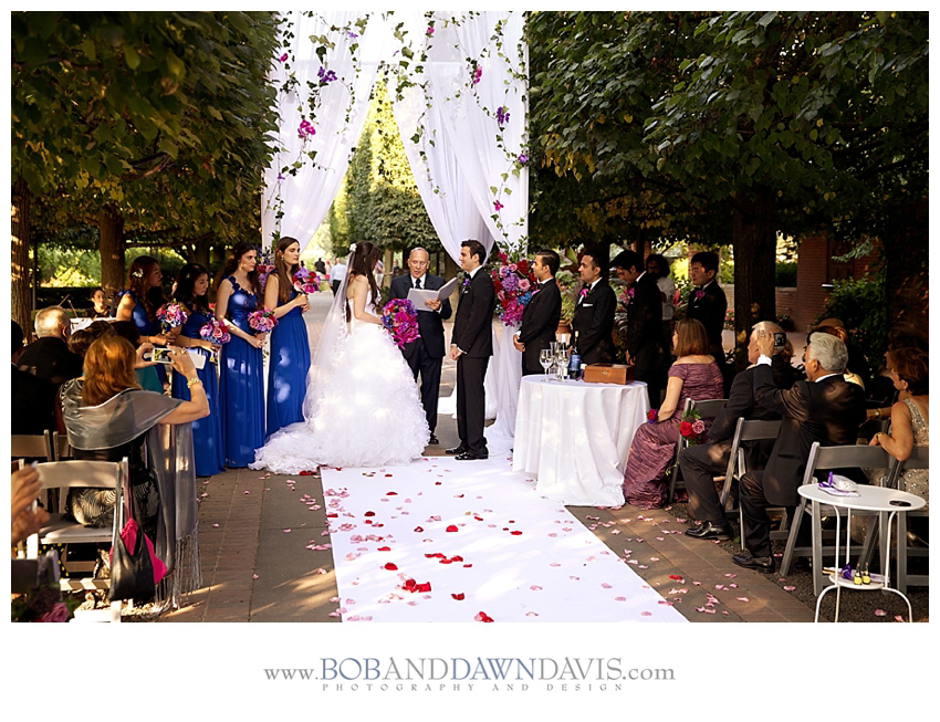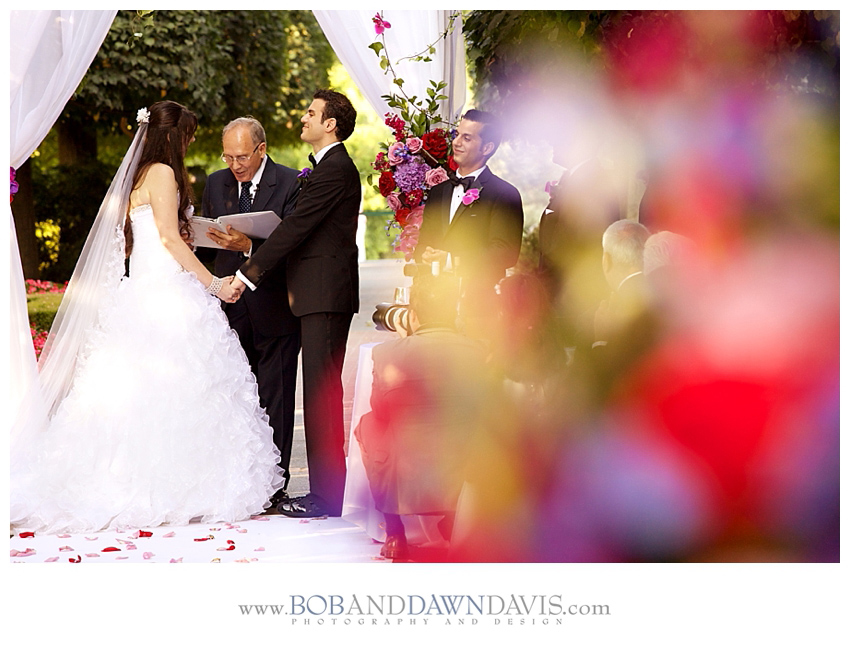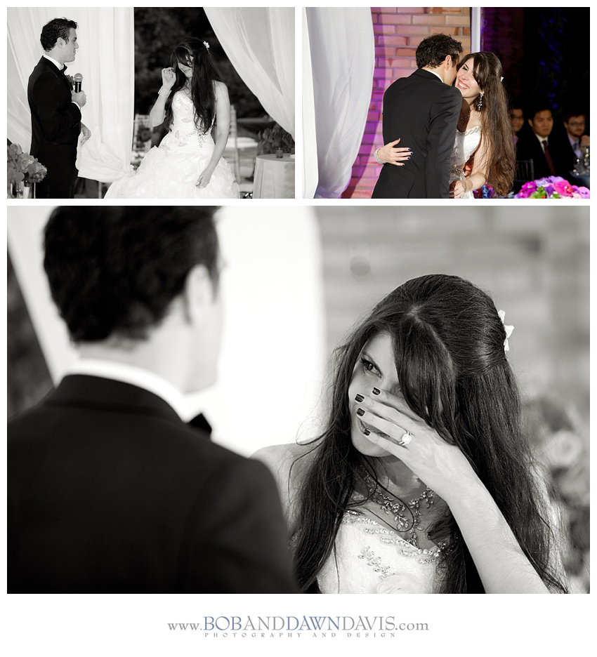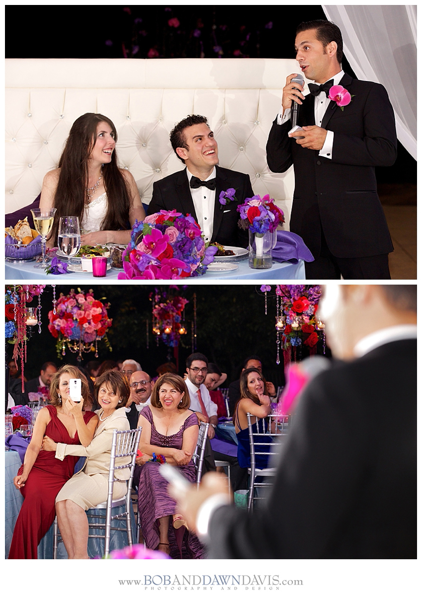 The first thing you need to do for your wedding day is hire the right event planner and that is exactly what Rocio and Cyrus did, they hired Claire Weller from Big City Bride to help her bring her ideas to reality. Claire is simply amazing and Bob loved working with her the day of the wedding. Rocio wanted a colorful wedding filled with the most amazing red, blue, pink and purple flowers throughout the entire day, and that is what she received. Studio AG Design was the Event Designers in charge of the lounge, draping, lighting and flowers... and wow did they bring it all together!!! Rocio's talented father hand painted the flowers for the table cards that were hung on a black manzanita tree with ribbon and crystals. During the reception, guests had an opportunity to write love notes to Rocio and Cyrus and hang them on the tree. Such a great idea!