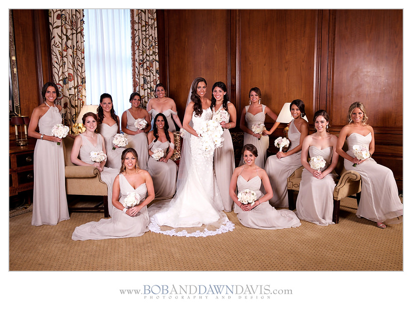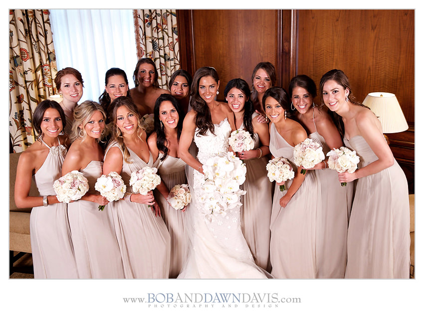 Sammi had 13 bridesmaids she wanted each to have the their own style dress. She chose a champagne Amsalechiffon dress and let her girls pick their own style from the collection, along with their own shoes.