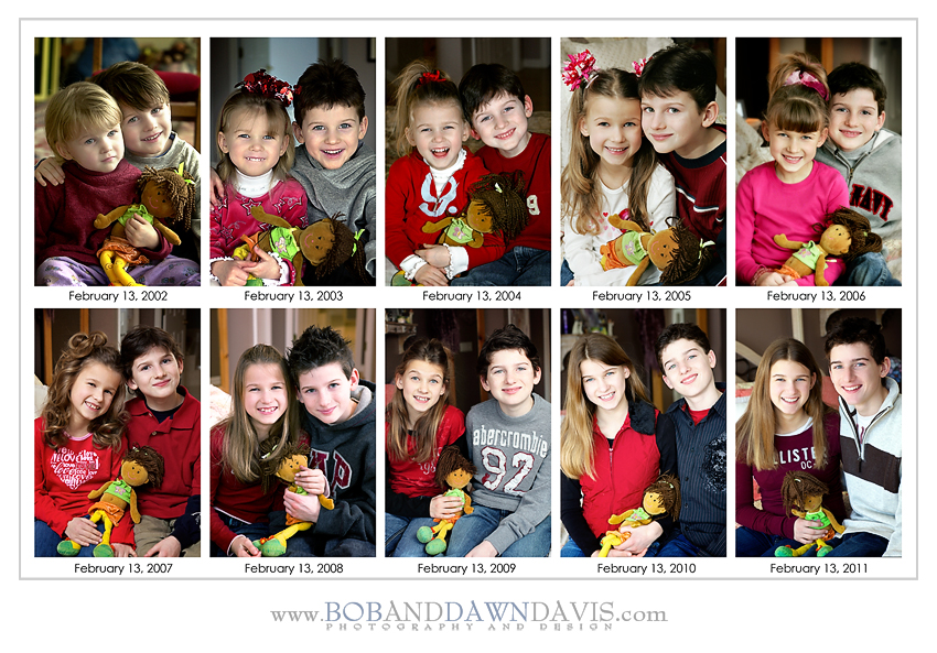 Every year we take a photo of Bobby and Alli on the same day February 13. The first one was taken in 2002 at Casa de Copii, the orphanage they lived in. Every year on that same day, Bob takes the same photo of them with Papusheka (Alli's little doll). It was the first gift we ever gave her.